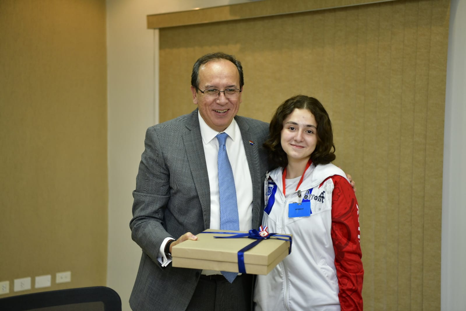 Al llegar de los EEUU los chicos llevaron un reconocimiento para el director de Itaipu por el apoyo