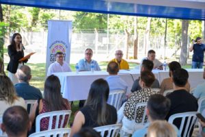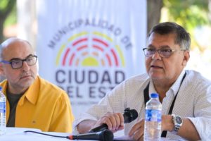 Durante la jornada, el intendente Daniel Pereira Mujica acompañó a los expositores: el Dr. en Derecho Benjamín Fernández Bogado, el economista Víctor Benítez y el politólogo Hugo Duarte, quienes abordaron los principales desafíos actuales y futuros del país.