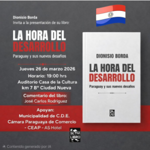 El próximo 26 de marzo a las 19:00 horas, el economista y exministro de Hacienda Dionisio Cornelio Borda presentará su nueva obra titulada “La hora del desarrollo: Paraguay y sus nuevos desafíos”, un material que propone un análisis profundo sobre la situación económica nacional y las oportunidades estratégicas para el futuro del país.